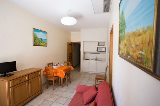 bilocale in muratura; primo piano; aria condizionata; area giorno con angolo cottura (due piastre elettriche); frigo; tv-LCD; 1 camera con letto matrimoniale; divano letto singolo in area giorno; bagno con cabina doccia idromassaggio e bidet. Balcone.
